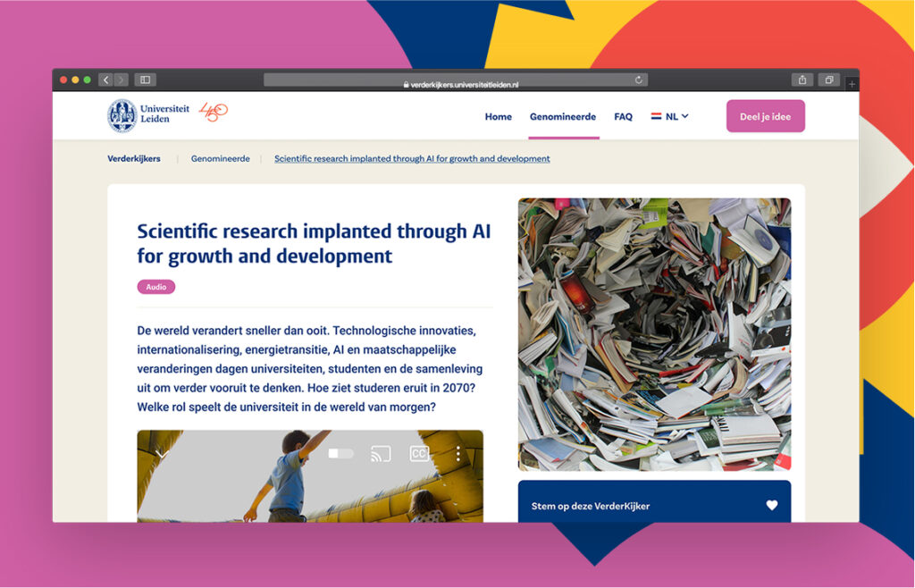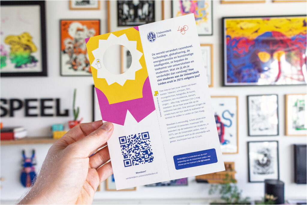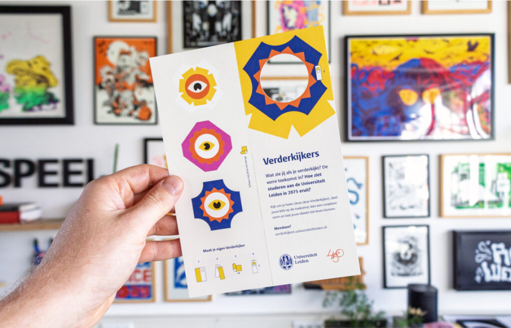 Hoe ziet studeren eruit in 2075? Voor de campagne Verderkijkers daagt de Universiteit Leiden uit om toekomstvisies te delen. Studio Speel ontwikkelde hiervoor de visuele identiteit, een aansprekende flyer en een kleurrijke website die uitnodigt tot verbeelding én interactie.