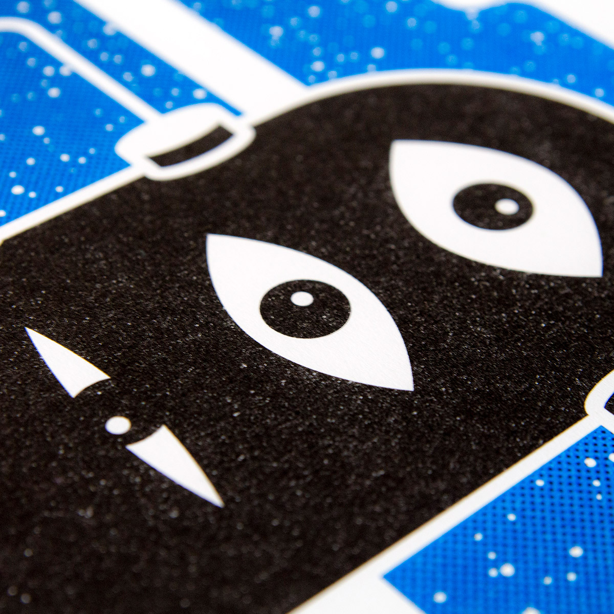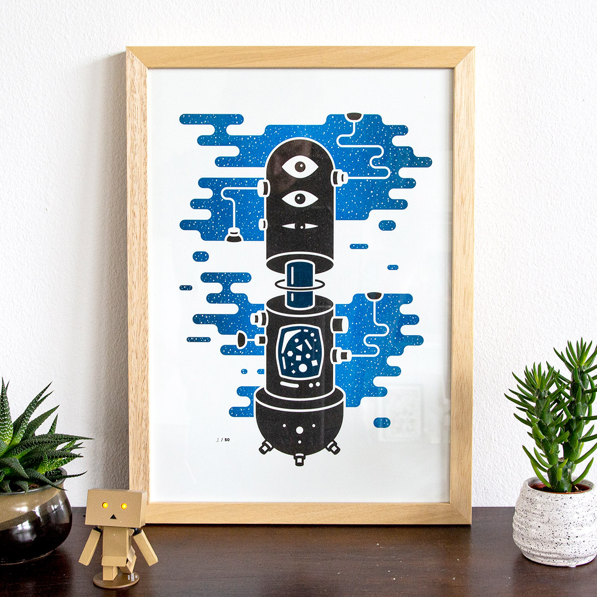 RISOprint van een robot zwevend door de ruimte. Deze robonaut zweeft door de ruimte op zoek naar ander leven! Terwijl hij overal materiaal opneemt uit het sterrenstelsel houdt hij zijn ogen scherp open. Altijd op zoek!